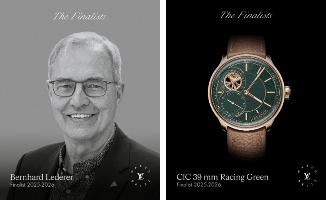 Lederer CIC 39 Racing Green 首次在腕表作品中实现完全运行的双重棘爪擒纵机构。其搭载配备双擒纵装置与双恒力装置的机芯,可呈现恒动能量传输。通过透明表背,可见由212枚零部件构成的机芯,及其双齿轮系与恒力机制;经喷砂工艺处理的哑光表盘则展露专利级擒纵装置与配以倒转秒针的叠构副表盘。39毫米表壳的厚度为10.75毫米,而机芯荣获 COSC 认证,98%由品牌自主制造。