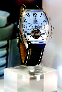 在展馆中,记者看到了一款堪称制作工艺世界一流的上海牌陀飞轮精品表。它精巧细致到无与伦比的外表让人叹为观止,不过它的价格也令人咋舌———10万元人民币。据上海表业有限公司工作人员介绍,这款专为上海牌表50华诞制作的珍藏版手表全球限量发行50只,目前已被预订了10余只。据介绍,此前刚有一位马上就要返程的外地商人愿意用现金现场付款买下这只样表,遗憾的是,样表概不出售。