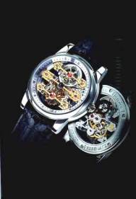 因此,陀飞轮(tourbillon)最大特色在于不受地心引力影响,可长保表机行走之精准度。它的擒纵系统除具备一般机械表中擒纵调速器的所有功能外,还会围绕着一个轴心,不停的作360度旋转,藉此不断调校系统的位置,令不同方位受地心吸力导致的走时误差得到补偿。