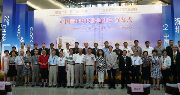 (《钟表》杂志记者王欢深圳现场报道)举世瞩目的《中国计时仪器通史》首发仪式在深圳会展中心举行,这部由中国计时仪器史学会(上卷)及中国钟表协会(下卷)作为主编的力作历时十余载,是几代计时仪器史人和钟表人心中夙愿的实现,同时也填补了中国计时仪器史研究的空白,是中国钟表行业大协作结成的成果,凝结了前辈、今人的心血与感情。在首发仪式上中国钟表协会张宏光副理事长、中国计时仪器史学会陈凯歌秘书长做了主题发言,作为参与此书编写的作者代表也纷纷发言,共议感慨。作为此书的编辑出版单位安徽教育出版社的领导也发言致辞,与会代表都怀着激动的心情共同见证此书的首发,最后所有参与编写此书的作者及给予大力支持的各地方钟表协会的代表合影留念,记住这一期盼已久时刻的到来。