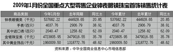 2009年1月份全国重点大型零售企业钟表眼镜珠宝首饰销售统计表