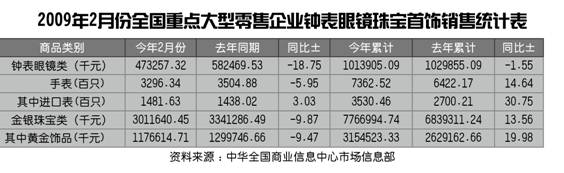 2009年2月份全国重点大型零售企业钟表眼镜珠宝首饰销售统计表