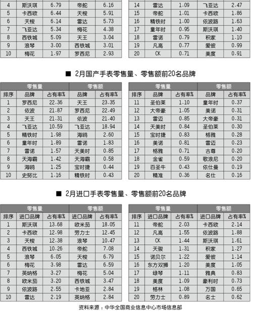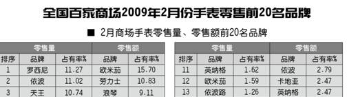 全国百家商场2009年2月份手表零售前20名品牌