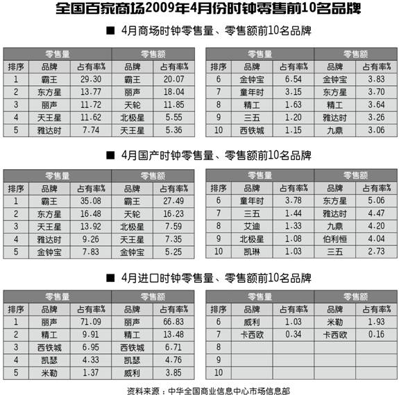 全国百家商场2009年4月份时钟零售前10名品牌