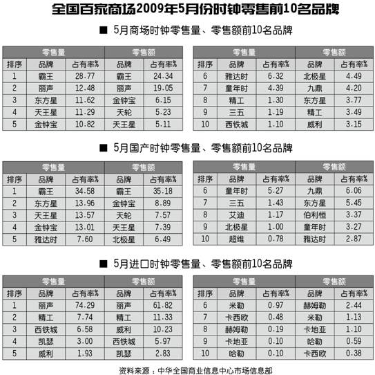 全国百家商场2009年5月份时钟零售前10名品牌