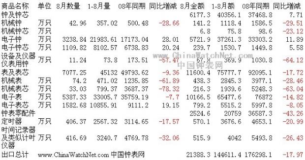 2009年8月中国钟表产品出口比上月增长了17%,但比去年同期下降17.97%。除了电子表芯、电子钟芯和电子钟呈正增长,其余产品类别均下滑严重,其中机械表和机械表芯下滑最严重,竟然达到-60%以上——
