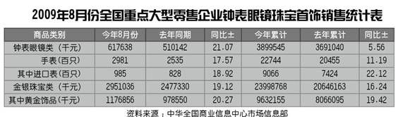 2009年8月份全国重点大型零售企业钟表眼镜珠宝首饰销售统计表