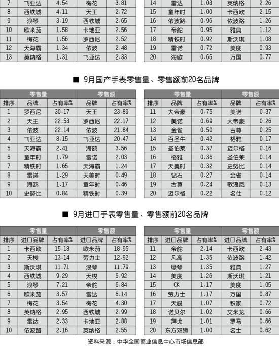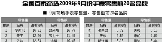 全国百家商场2009年9月份手表零售前20名品牌