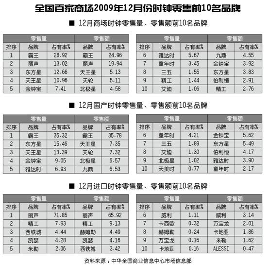 全国百家商场2009年12月份时钟零售前10名品牌