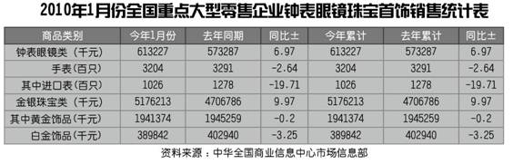 2010年1月份全国重点大型零售企业钟表眼镜珠宝首饰销售统计表