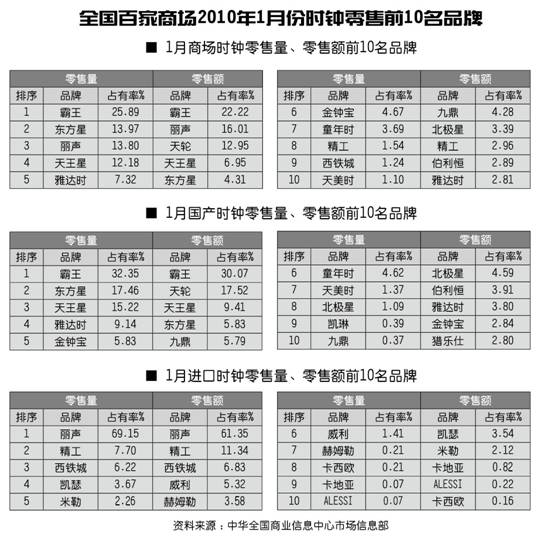 全国百家商场2010年1月份时钟零售前10名品牌