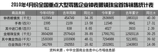 2010年4月份全国重点大型零售企业钟表眼镜珠宝首饰销售统计表