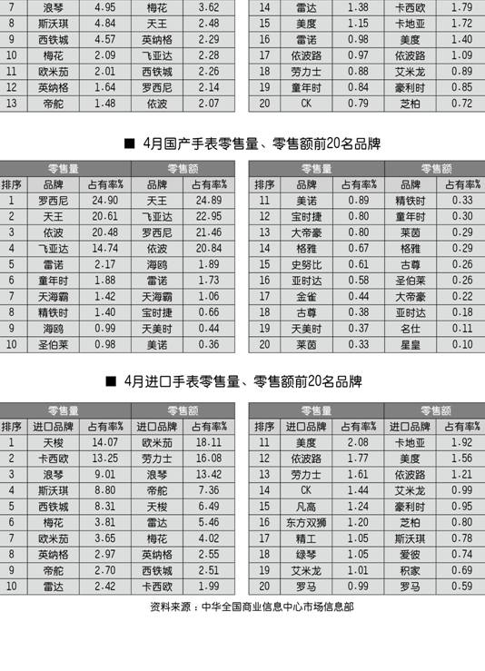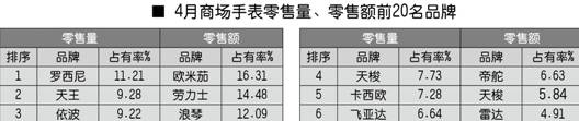 全国百家商场2010年4月份手表零售前20名品牌