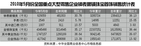 2010年5月份全国重点大型零售企业钟表眼镜珠宝首饰销售统计表
