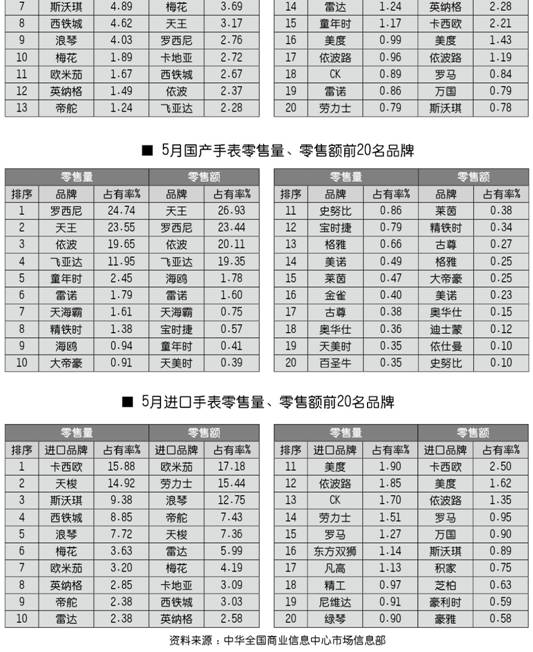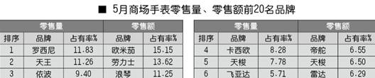 全国百家商场2010年5月份手表零售前20名品牌