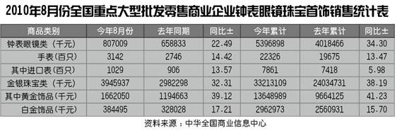 2010年8月份全国重点大型零售企业钟表眼镜珠宝首饰销售统计表