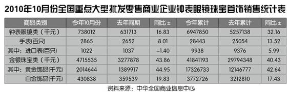 2010年10月份全国重点大型零售企业钟表眼镜珠宝首饰销售统计表