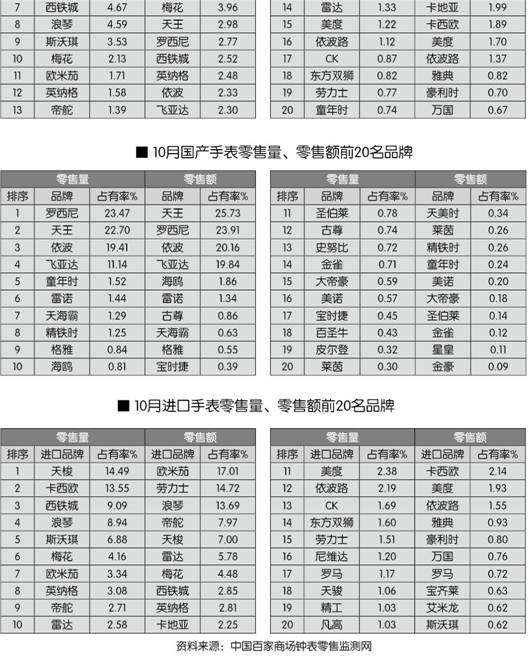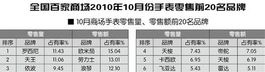 全国百家商场2010年10月份手表零售前20名品牌