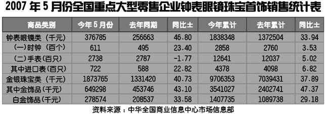 2007年5月份全国重点大型零售企业钟表眼镜珠宝首饰销售统计表