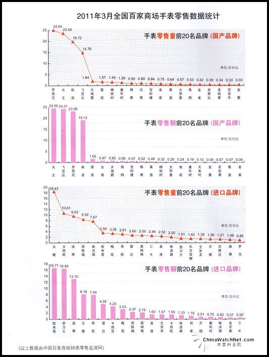 国产品牌 零售量:前二十名,罗西尼24.94%、天王23.50%、依波19.72%、飞亚达14.76%排在前四位,接下来是天海霸1.84%、雷诺1.57%、精铁时1.49%、童年时1.26%、格雅0.90%、古尊0.89%、宝时捷、美诺、莱茵、大帝豪、海鸥、金雀、史努比、圣伯莱、百圣牛、金豪。 零售额:前二十名,天王24.56%、飞亚达24.31%、罗西尼23.08%、依波19.12%排在前四位、接下来是雷诺1.65%、古尊0.87%、天海霸0.85%、海鸥0.68%、宝时捷0.57%、格雅0.52%、莱茵、精铁时、大帝豪、美诺、童年时、天美时、金豪、圣伯莱、星皇、金雀。