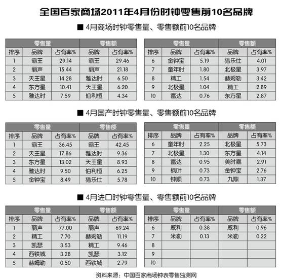 全国百家商场2011年4月份时钟零售前10名品牌