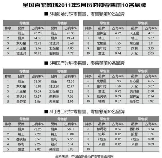 全国百家商场2011年5月份时钟零售前10名品牌