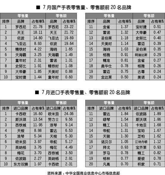 20007年7月全国百家商场手表零售量、零售额前20名品牌