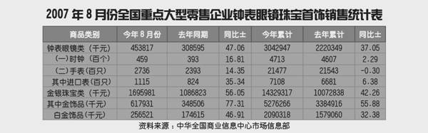 2007年8月份全国重点大型零售企业钟表眼镜珠宝首饰销售统计表