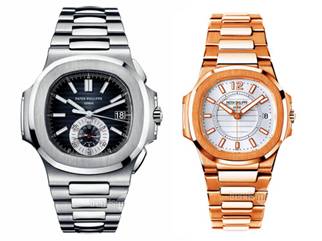 百达翡丽Nautilus系列自1976年诞生,填补了表坛一个空白,多年来未有可以与之相提并论的作品,是休闲手表中的经典。男表Ref.5980/1A,不锈钢舷窗形表壳,最宽处45.6毫米,最窄处38.5毫米,黑色表盘,带计时和瞬跳日历功能。女表Ref.7011/1R,玫瑰金表壳,最宽处35.4毫米。