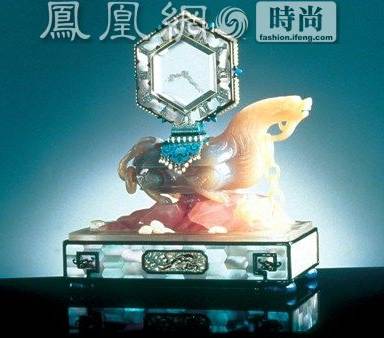 软玉制成的中式门廊,设有滑动式时钟,钟面以软玉雕琢而成,配以钻石指针及具有浓厚中国色彩的黑珐琅彩金边外框,古香古色。座钟以缟玛瑙制成,缀以精致珊瑚装饰。曾是影星Barbra Streisand的私人珍藏。