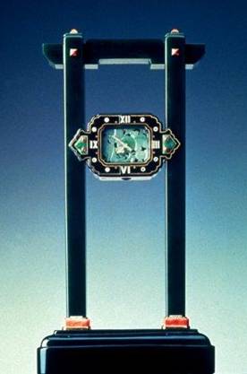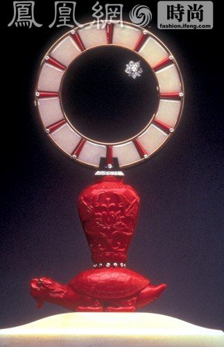 十九世纪中国式设计,以珊瑚雕成象征长寿的小龟为主题。配以珊瑚花瓶及钻石装饰,底部则以玛瑙为基座。水晶钟面围以玛瑙外框,上面饰有珊瑚及缟玛瑙装饰,再陪衬星形钻石指针,高贵优雅。