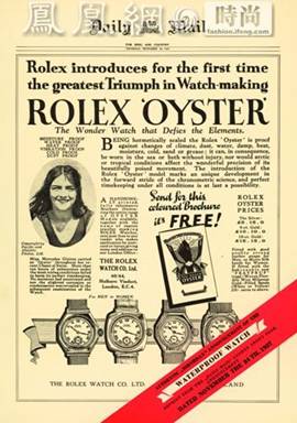 劳力士与1926年开创了“蚝式腕表(Oyster)”的先河,这一根据牡蛎壳设计防水表壳在那个时代表现出超凡的防水性能。当1927年Gleitze佩戴一只劳力士蚝式腕表成功横渡英吉利海峡,腕表丝毫无损后。劳力士声名鹊起,终成一代顶级名表。
