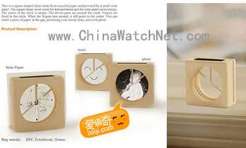 之所以说空洞时间不走寻常路,是因为空洞时间在设计方面逃出了设计的套路:老的钟表时针以钟表的圆心“自转”,而空洞时间的圆心没有变,但是它的时针是围绕圆心“公转”。时,分,秒三个指针为三个并排圈圈,构成一个“洞”,切合主题。设计者做这个特别的设计还有另外一个用意:提倡绿色环保。空洞时间的材料为再生纸,这样就可以减少金属的使用。而且空洞时间的动力为太阳能,这样就可以减少电池的使用。如果您愿意的话你可让空洞时间变的不是那么空,您可以在它的玻璃上有趣的涂鸦或插入可爱的大头照,老照片等。这样就将时间和美好回忆完美的结合在一起了。