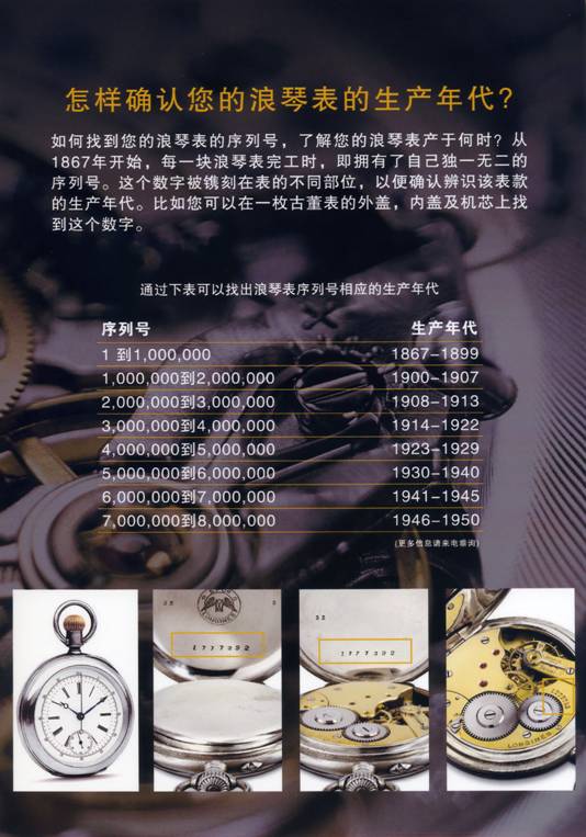 找到您的浪琴表序列号,然后再根据以下这个表格,即可断定您的表产于何时。当然这个数字越小,您的浪琴表就越珍贵古老。