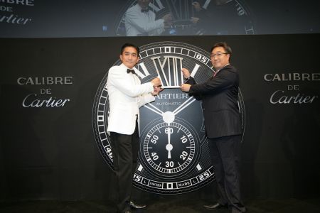 梁朝伟先生与卡地亚远东区行政总裁陆慧全先生一同将巨大的罗马数字XII嵌入表盘瞬间
