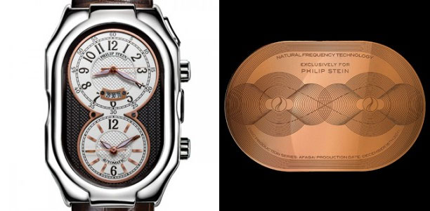 ‘Prestige Automatic Gents Philip Stein’远远不止是一块手表。双子表盘的表面具有双时区和日期显示,其背后展现惊人的功能财富。其表壳的核心特点是一个被称为自然频率芯片的薄金属板。当人们佩戴此表时,地球的基本频率通过这个芯片传输与人体生物场互动。