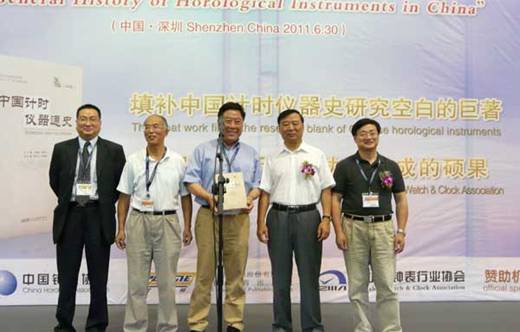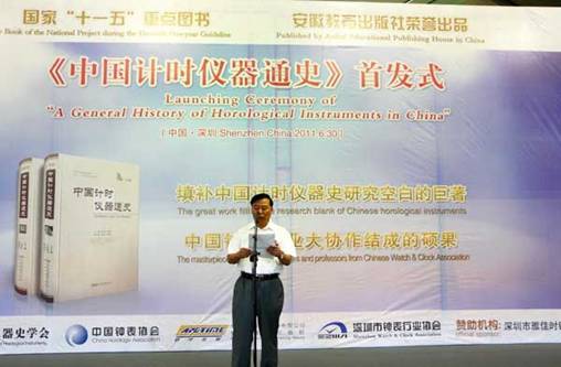 (《钟表》杂志记者王欢深圳现场报道)举世瞩目的《中国计时仪器通史》首发仪式在深圳会展中心举行,这部由中国计时仪器史学会(上卷)及中国钟表协会(下卷)作为主编的力作历时十余载,是几代计时仪器史人和钟表人心中夙愿的实现,同时也填补了中国计时仪器史研究的空白,是中国钟表行业大协作结成的成果,凝结了前辈、今人的心血与感情。在首发仪式上中国钟表协会张宏光副理事长、中国计时仪器史学会陈凯歌秘书长做了主题发言,作为参与此书编写的作者代表也纷纷发言,共议感慨。作为此书的编辑出版单位安徽教育出版社的领导也发言致辞,与会代表都怀着激动的心情共同见证此书的首发,最后所有参与编写此书的作者及给予大力支持的各地方钟表协会的代表合影留念,记住这一期盼已久时刻的到来。