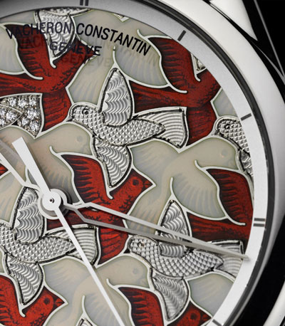 该表的设计灵感则源自Maurits Cornelis Escher的一幅绘画作品 – 他是一位在结构、透视和空间方面相当有名的荷兰陶瓷和绘画艺术家(1898-1972)。这枚腕表表盘上描绘的红色和白色的飞翔的和平鸽,是Vacheron Constantin江诗丹顿特地以Only Watch慈善拍卖的代表色红与白结合Métiers d’Art的特点打造而成。Manufacture.