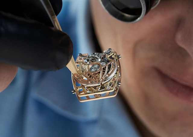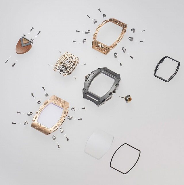 这款机芯是品牌全新美学的标志, 更是RICHARD MILLE独有的机械奥秘。底板由5N红金加工而成, 高度镂空的桥板则是由经微喷砂和手工倒角处理的3N黄金制成。类帆布编织的镂空结构与表壳线条相映成趣, 并以五级钛合金拱形结构衬托出陀飞轮。
