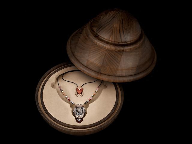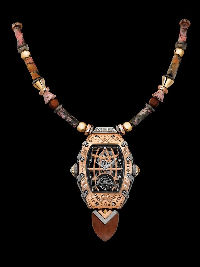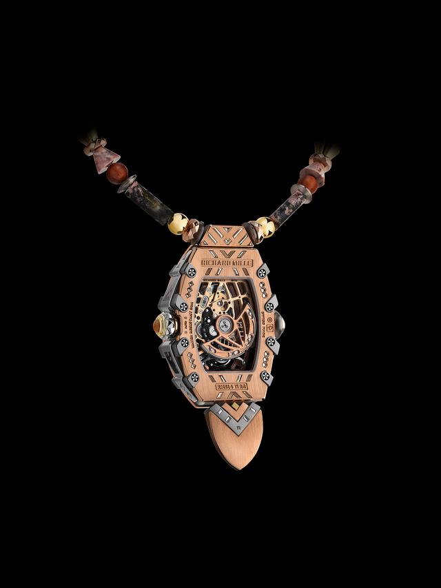 RM S14作为吊坠佩戴在颈部, 打破了传统腕表概念,也是RICHARD MILLE对吊坠形态的首次尝试。项链由石楠木、红金、钛合金和蔷薇辉石珠组成, 通过金属与橡胶材质的线绳串联, 并配有可调节式的项链扣。项链扣巧妙整合了5N红金、抛光钛合金珠和石楠木, 与錶款6点钟位置的同材质嵌饰首尾呼应, 浑然一体。