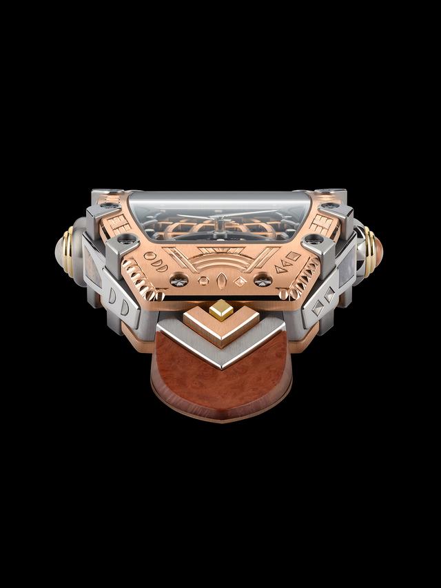 由抛光五级钛合金所打造的爪扣将表圈牢牢固定, 爪扣自身镶有手工切割的瑞士蔷薇辉石嵌件。共配有16枚爪扣, 都由让人联想到花朵图案的花键螺丝固定。二元对立的昼夜元素设计贯穿着整只时计, 尤其体现在机芯两侧非传统的双表冠设计。