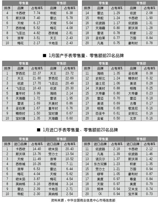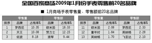 全国百家商场2009年1月份手表零售前20名品牌