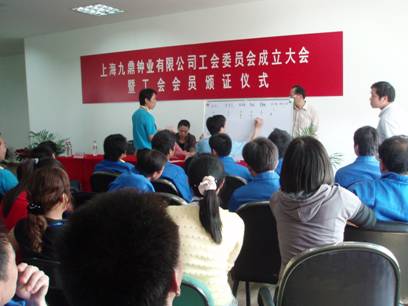 上海九鼎钟业有限公司原是一家温州企业,2001年落户上海,主要生产落地钟、挂钟及钟表配件,员工99%来自于全国各地。通过几年的创业和发展,经营规模逐年扩大,使九鼎牌高档落地钟响誉全国。在经营发展的同时,企业领导班子感到企业的精神文明建设,企业的文化建设,法律和法规宣传教育等,越显重要,已成为企业进一步创新和发展的推动力。总经理金飞鹏积极支持企业建立工会的想法,得到了上海轻工业工会联合会、上海钟表行业分会以及上海市钟表行业协会的支持,通过近一个月的筹备,企业的工会委员会以无记名投票的方式选举产生了以李辛仓主席为首的新一届工会委员会。