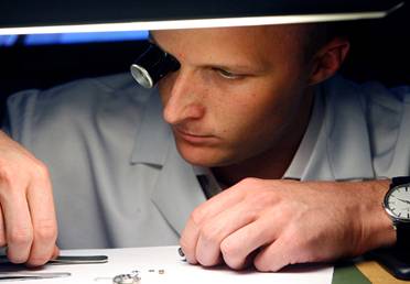 瑞士钟表技师在世博园瑞士城市馆里现场展示制作手表工艺。