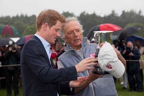 HRH Prince Harry哈里王子殿下和Talandracas队的赞助人Edouard Carmignac仔细观察Queen’s Cup皇后杯奖杯(Centaur Photographic/Guards Polo Club)