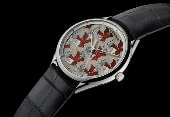 该表的设计灵感则源自Maurits Cornelis Escher的一幅绘画作品 – 他是一位在结构、透视和空间方面相当有名的荷兰陶瓷和绘画艺术家(1898-1972)。这枚腕表表盘上描绘的红色和白色的飞翔的和平鸽,是Vacheron Constantin江诗丹顿特地以Only Watch慈善拍卖的代表色红与白结合Métiers d’Art的特点打造而成。Manufacture.