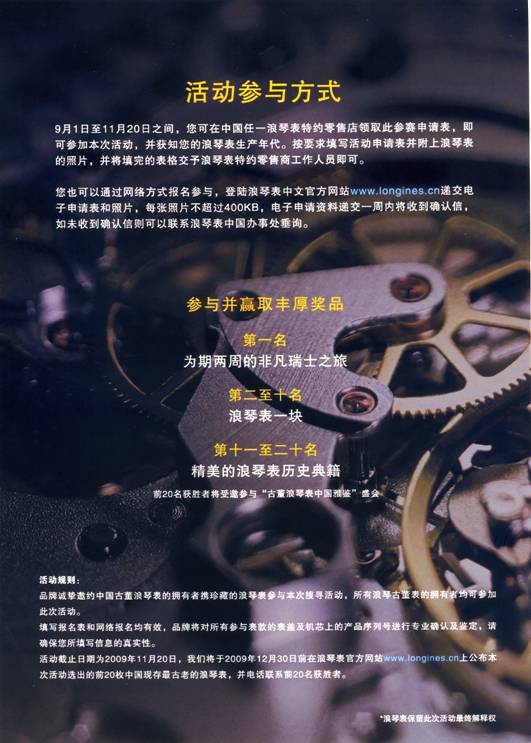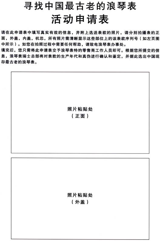 浪琴表与中国近一个半世纪的传奇关系耐人回味,为挖掘浪琴表在中国的悠久历史、传奇故事,展现浪琴表百多年来的卓越产品与优雅精神,品牌倾情发起“寻找中国最古老的浪琴表”活动:2009年9月1日至11月20日,品牌诚挚邀约中国古董浪琴表的拥有者携珍藏的浪琴表参与本次搜寻活动。古董浪琴表主可至品牌在中国的任一特约零售商处,或从浪琴表中文官方网站获取参与申请表,提交自己表款的相关信息和照片即可。品牌将对所有参与表款的表盖及机芯上的产品序列号进行专业确认及鉴定,从而甄选出中国现存的生产年代最久远的浪琴表20枚。
