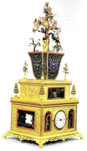 铜鎏金珐琅嵌宝石料转花花盆顶报时鸟音乐钟
